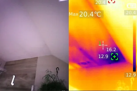 W drugim będzie trudniej, gdyż bez pozbycia się mostków cieplnych para wodna w łazience będzie stale wykraplać się na suficie, przyspieszając rozwój pleśni w sezonie zimowym. Malowanie lub doraźne usuwanie pleśni, które sprawdza się w innych przypadkach nic tu nie pomoże. Doskonale widzimy to na termowizji: